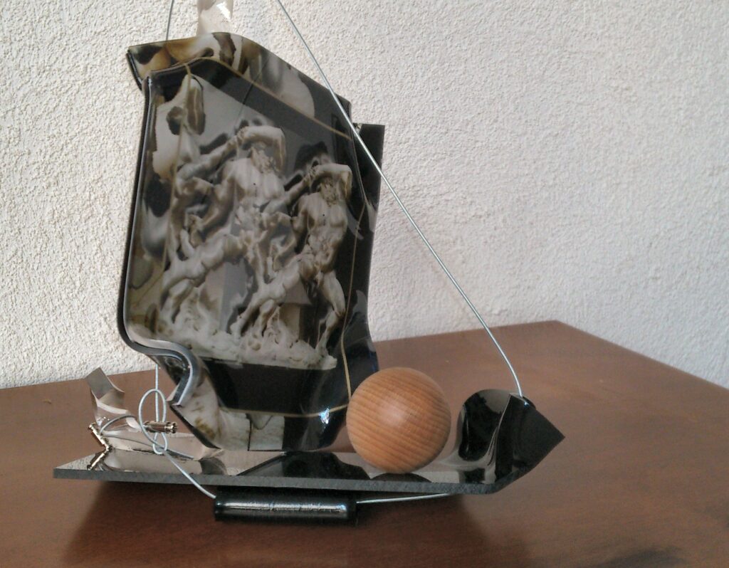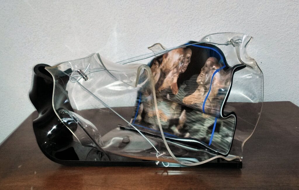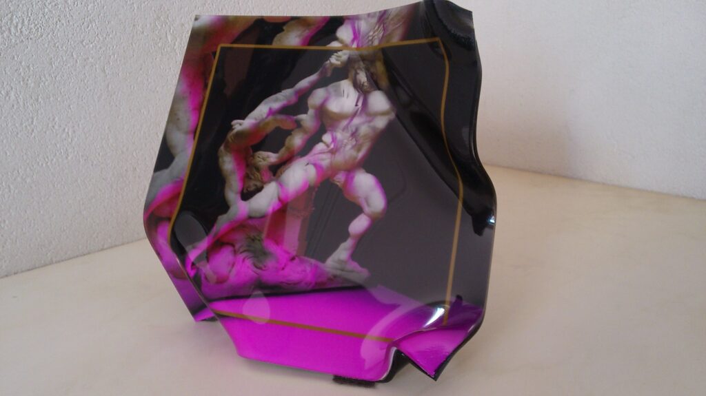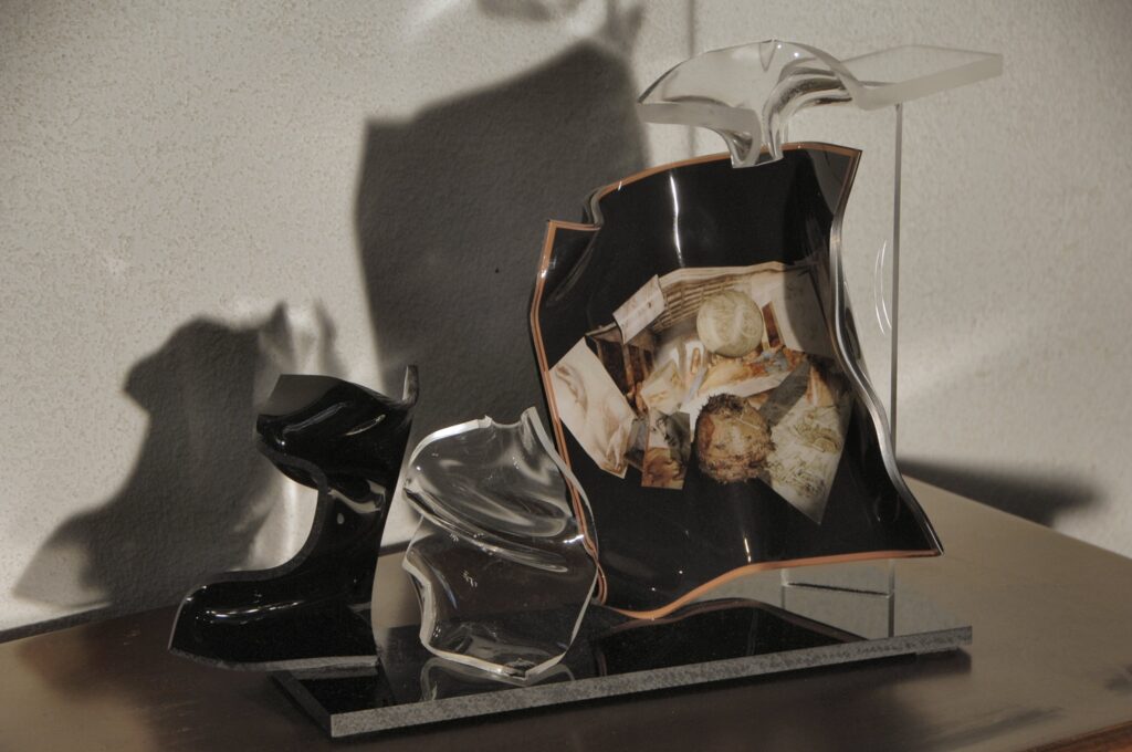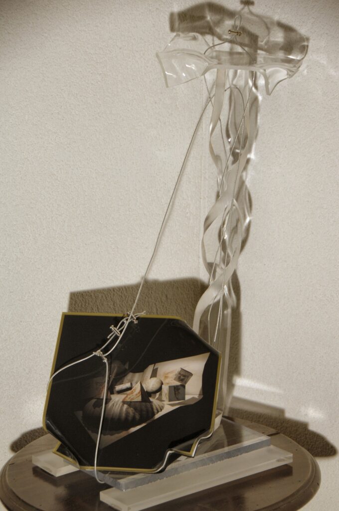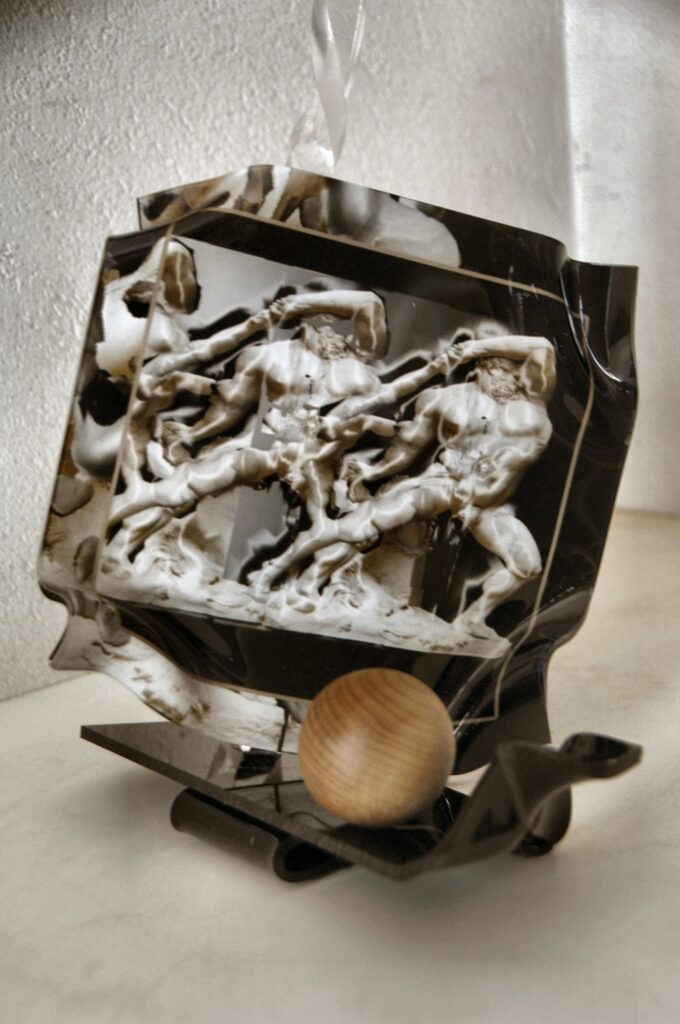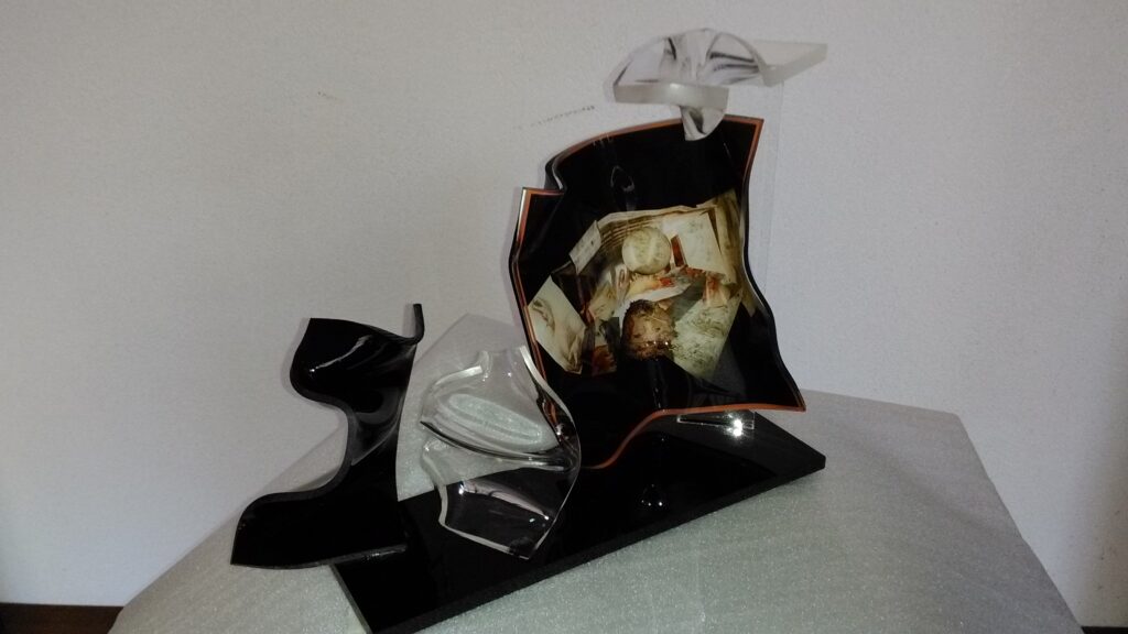 Listelli di plexiglass, fotografie stampate su lastre di plexiglass, termodeformarle con una pistola termica, assemblarle, costruire qualcosa che assomigli ad una scultura, senza essere uno scultore. Incollare e fissare i pezzi; un lavoro a caldo ed interessante…