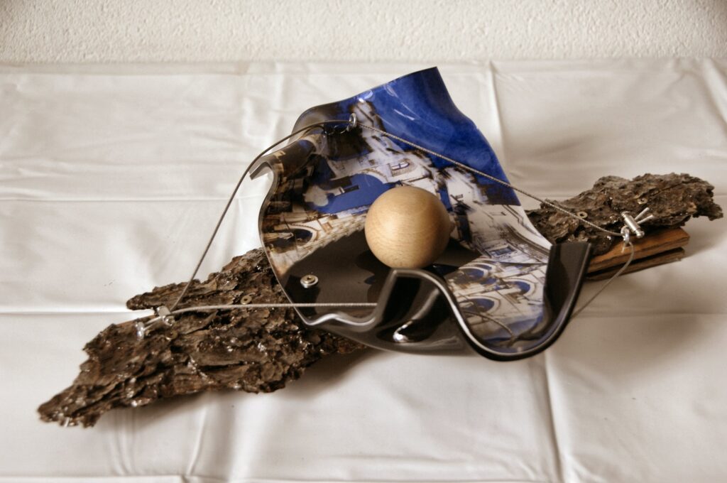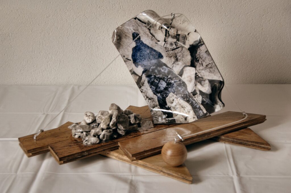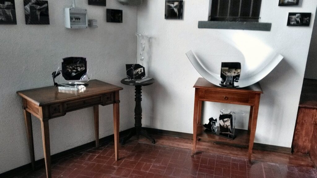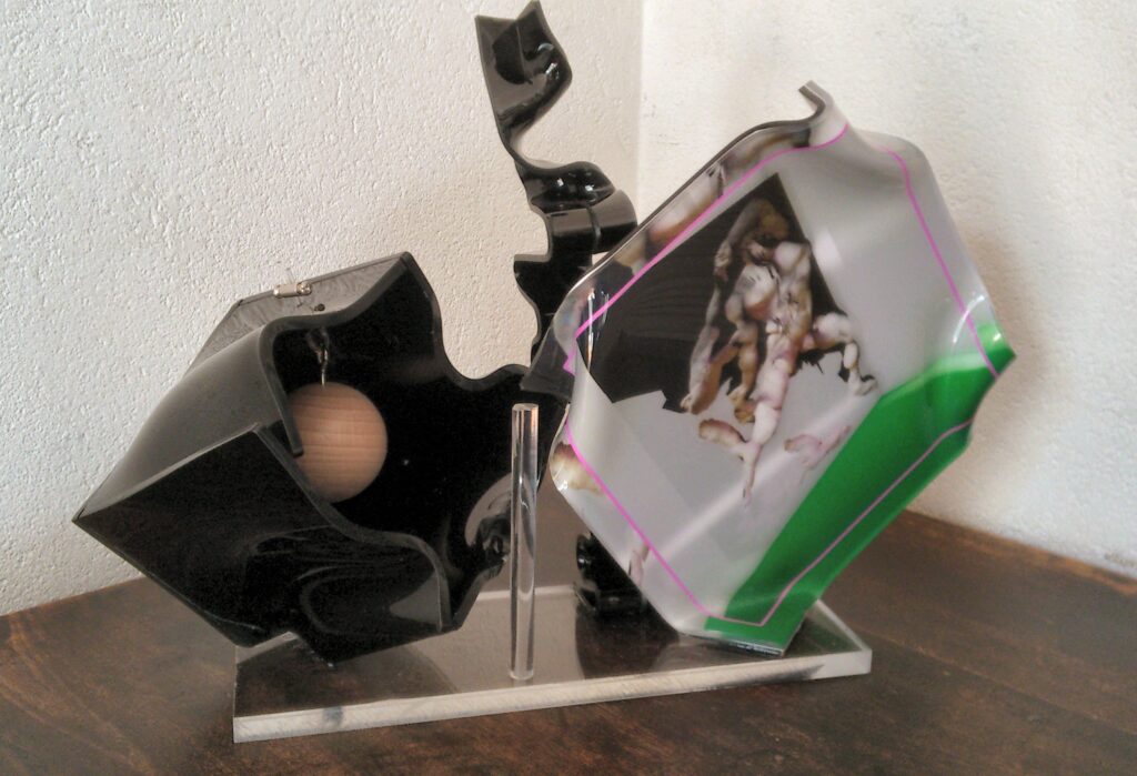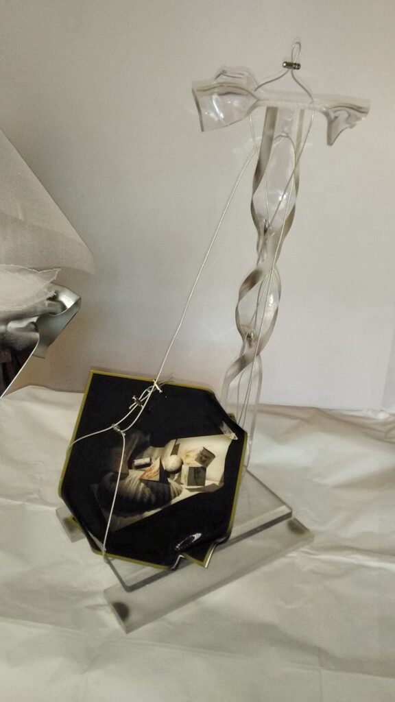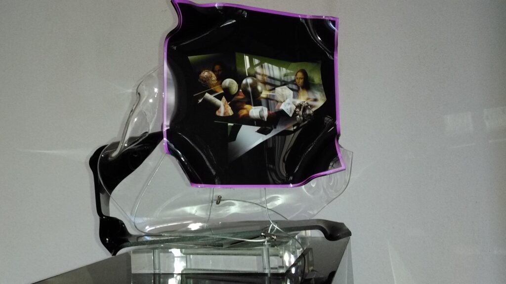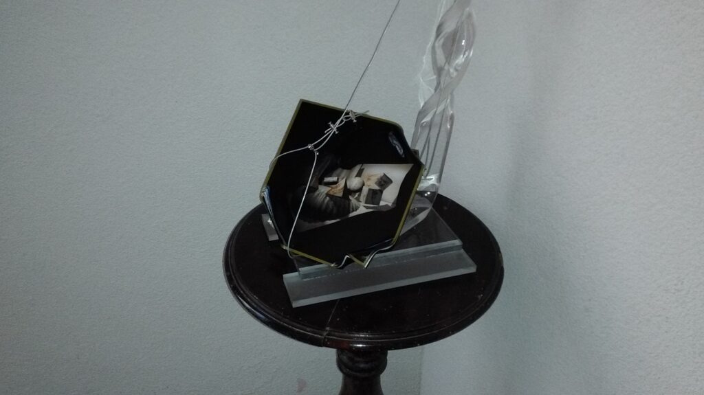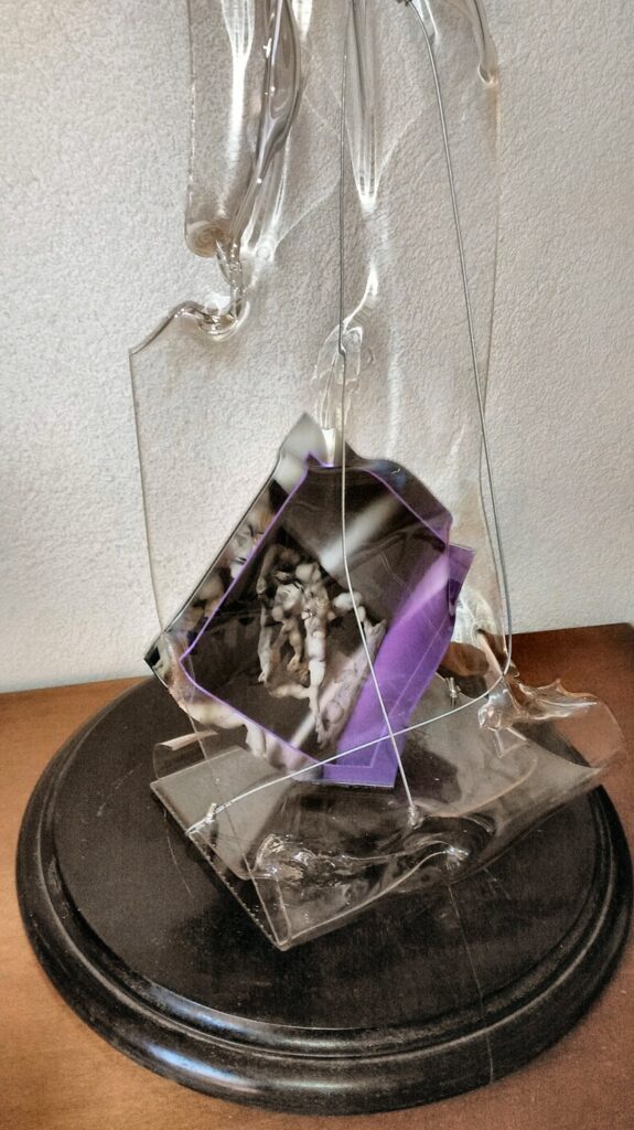 Listelli di plexiglass, fotografie stampate su lastre di plexiglass, termodeformarle con una pistola termica, assemblarle, costruire qualcosa che assomigli ad una scultura, senza essere uno scultore. Incollare e fissare i pezzi; un lavoro a caldo ed interessante…