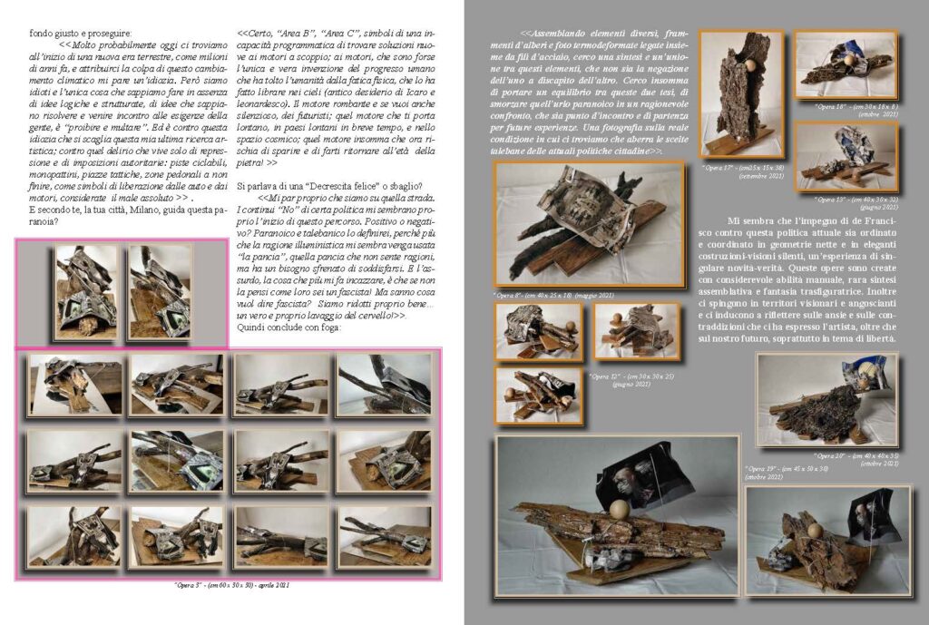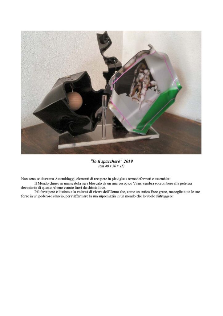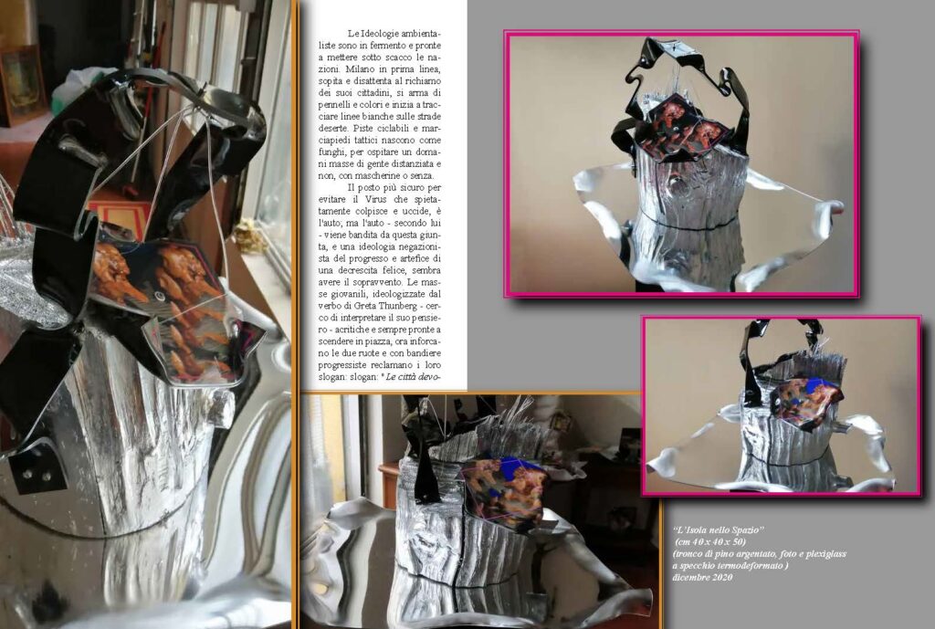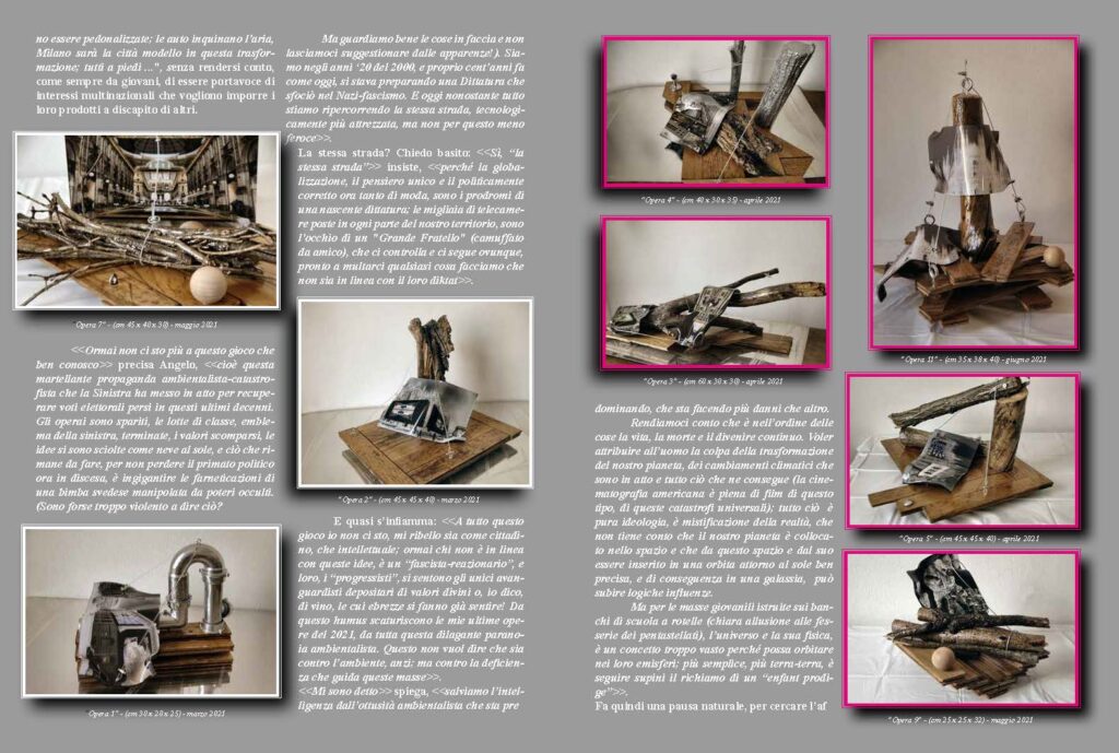 Nel 2021, Angelo subisce un’ulteriore trasformazione e si dedica a una nuova ricerca. E lui stesso a raccontarlo: <<Nel 2021 mi ha preso un nuovo stimolo creativo, ispirato dalla dilagante paranoia ambientalista. Mi sono detto: salviamo l’intelligenza, l’ottusità ambientalista che sta predominando, facendo più danni che altro. Rendiamoci conto che è nell’ordine delle cose la Vita, la Morte e il Divenire continuo. Voler attribuire all’uomo la colpa della trasformazione del nostro Pianeta è pura ideologia, che non tiene conto che esso è collocato nello Spazio e che da questo può subire logiche influenze. Molto probabilmente oggi ci troviamo all’inizio di una nuova era terrestre, come milioni di anni fa, e attribuirci la colpa mi pare un’idiozia>>. Fa quindi una pausa naturale, per cercare l’affondo giusto e proseguire: <<Però siamo idioti e l’unica cosa che sappiamo fare è “proibire e multare”. Ed è contro questa idiozia che si scaglia questa mia ultima ricerca artistica; contro quel delirio che vive solo di repressione e di imposizioni autoritarie: piste ciclabili, monopattini, piazze tattiche, come simboli di liberazione dalle auto, il male assoluto>>.