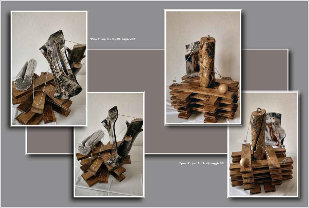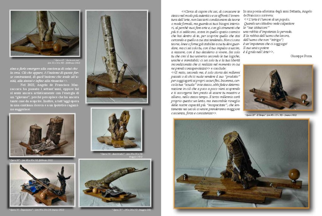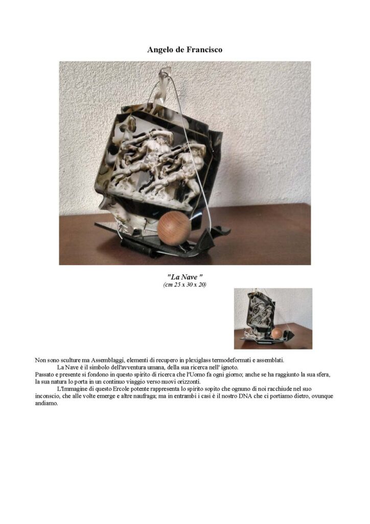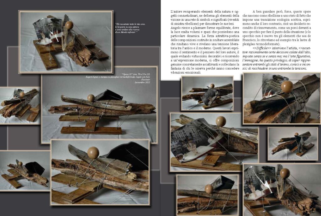 Angelo riesce a plasmare forme equilibrate, dove la luce esalta volumi e spazi che possiedono una particolare dinamica. La forza astrattiva-poetica delle composizioni costruite in sculture assemblate che risultano vive e rivelano una tensione liberatoria tra l’antico e il moderno. Questi lavori esprimono il sentimento e il pensiero del loro autore, il quale evitando virtuosismi decorativi e ricorrendo a un’espressione moderna, ci offre composizioni genuine concretamente accattivanti e sollecitano la fantasia di chi le osserva perché sanno concedere vibrazioni emozionali.