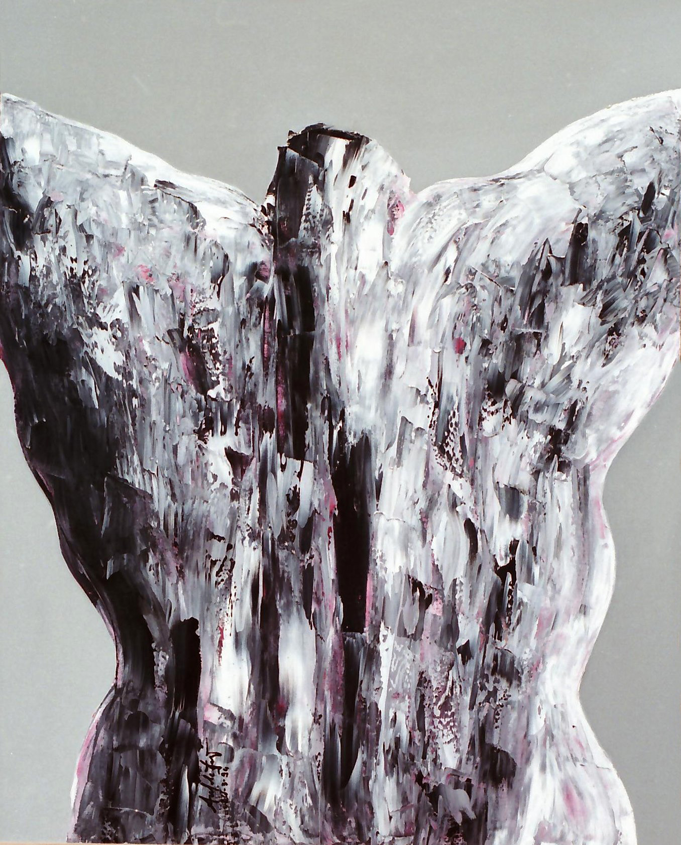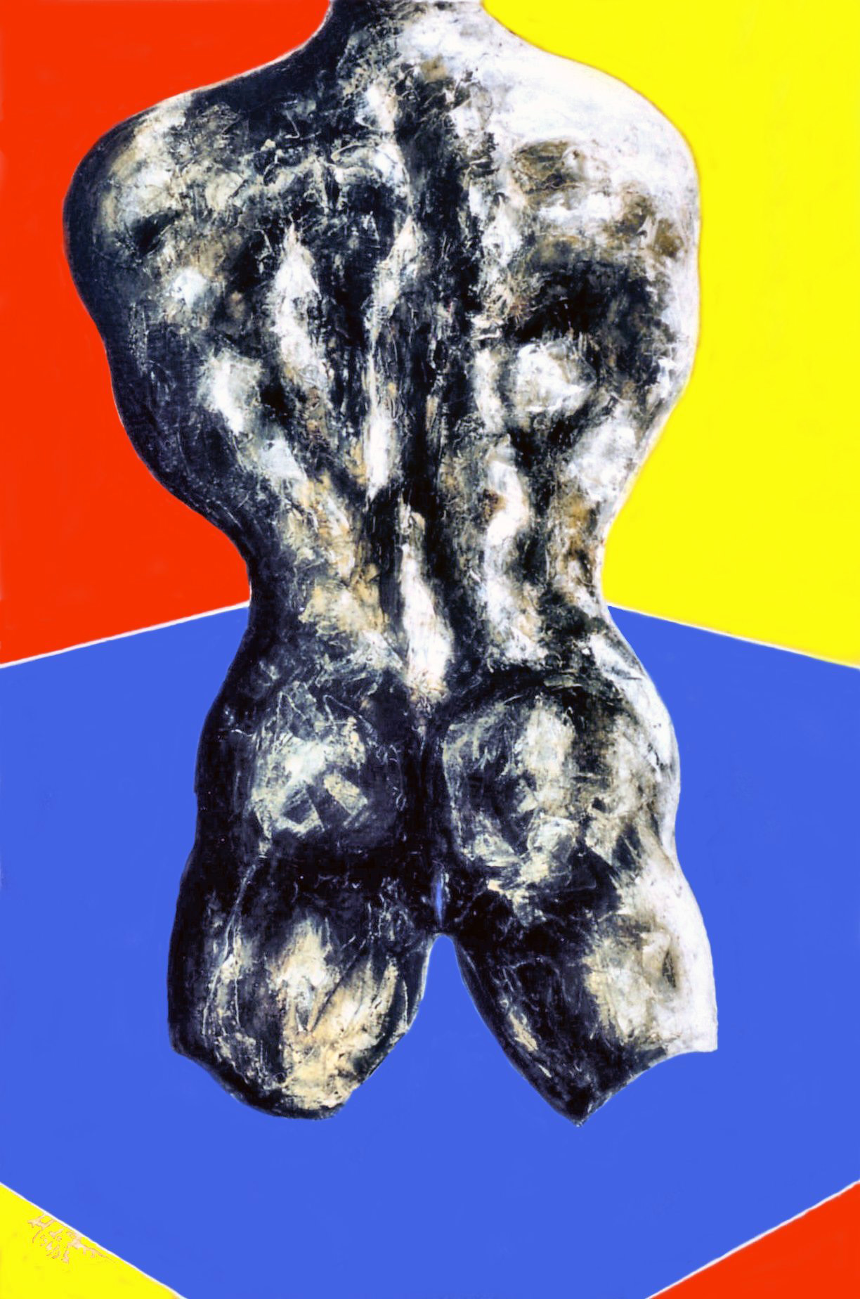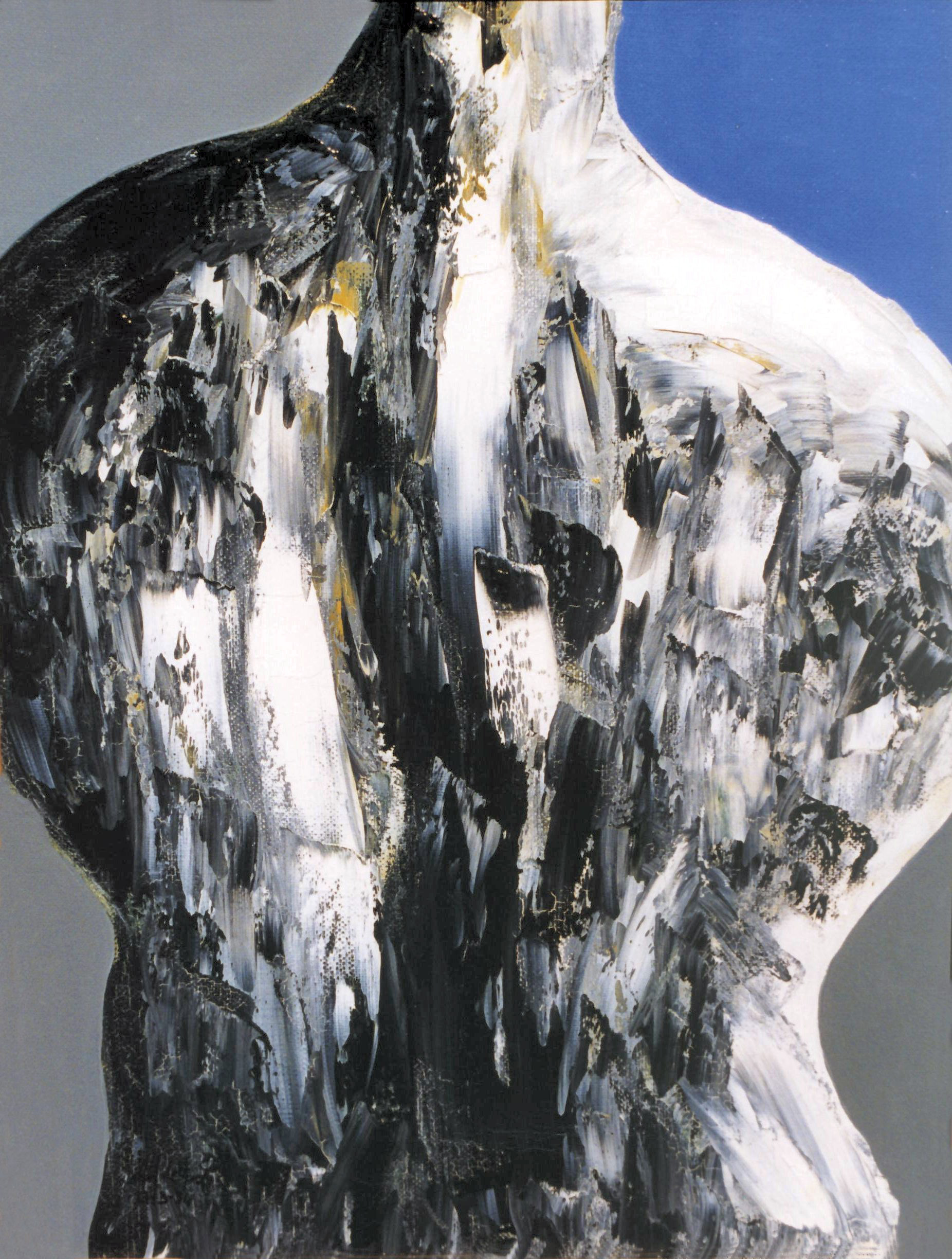 Nel Ciclo successivo, però, ritorna alla pittura ad olio che aveva momentaneamente abbandonato, con una pennellata più fluida e quasi stinta, simile all’acquarello. I soggetti sono ancora corpi o torsi di persone, dove il pennello, ma spesso la spatola usata a guisa di scalpello, ne “sbrandella“ la forma e scava all’interno di quella sagoma, come a significare che il dramma che agita la figura è solo all’interno di quell’io, di quel soggetto, non fuori da lui. A questo punto si mescolano colori e luci e ombre, a neri e bianchi, i quali si fondono e stridono in grigi multicolori. La pittura si fa astratta, all’interno di una sagoma figurale dal contorno ben delimitato; si fa musica cacofonica dalle note squillanti, chiare; diviene grido, consapevolezza nella sua essenza di vita; la pittura, infine, si fa coscienza dell’artista che la crea.