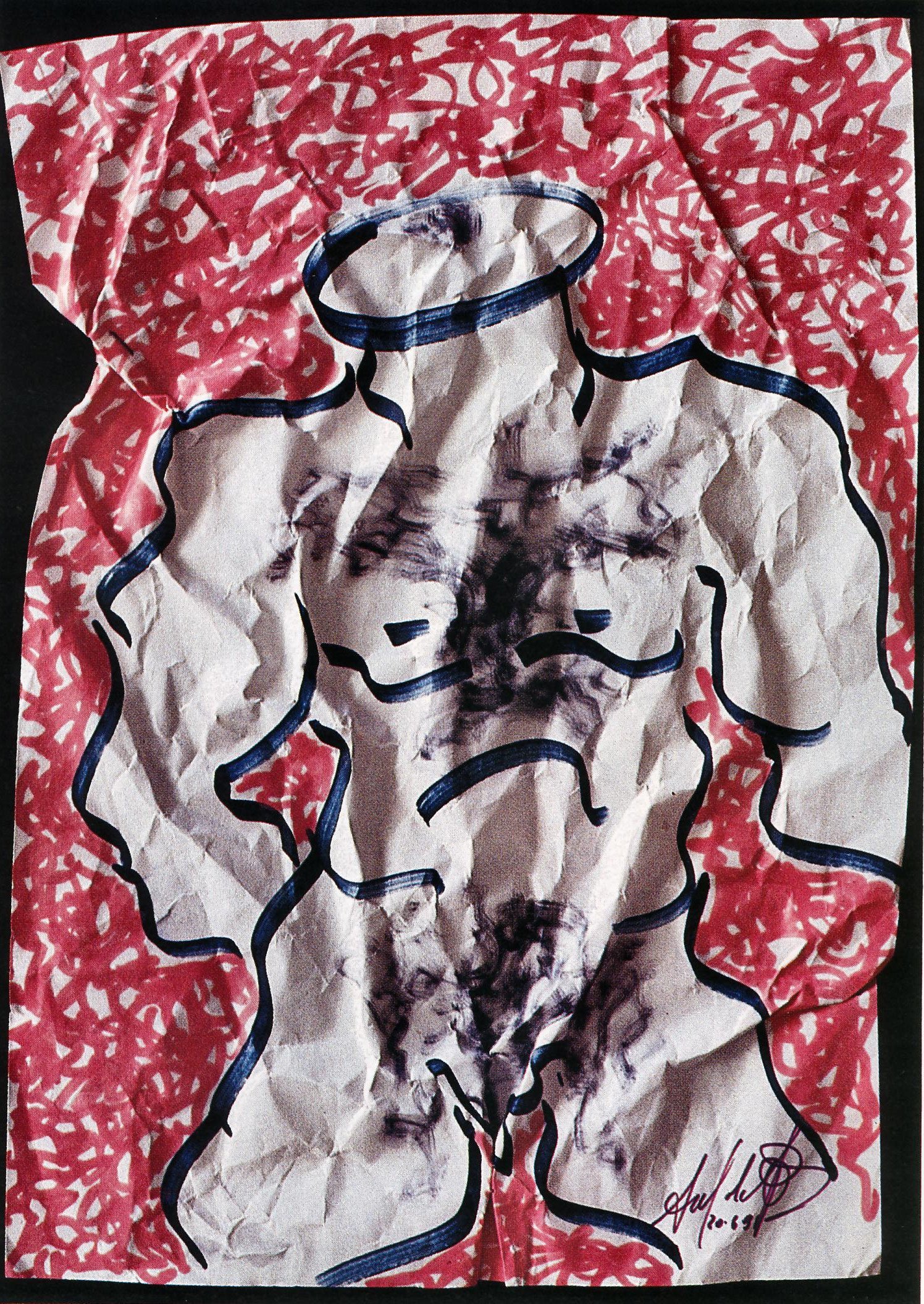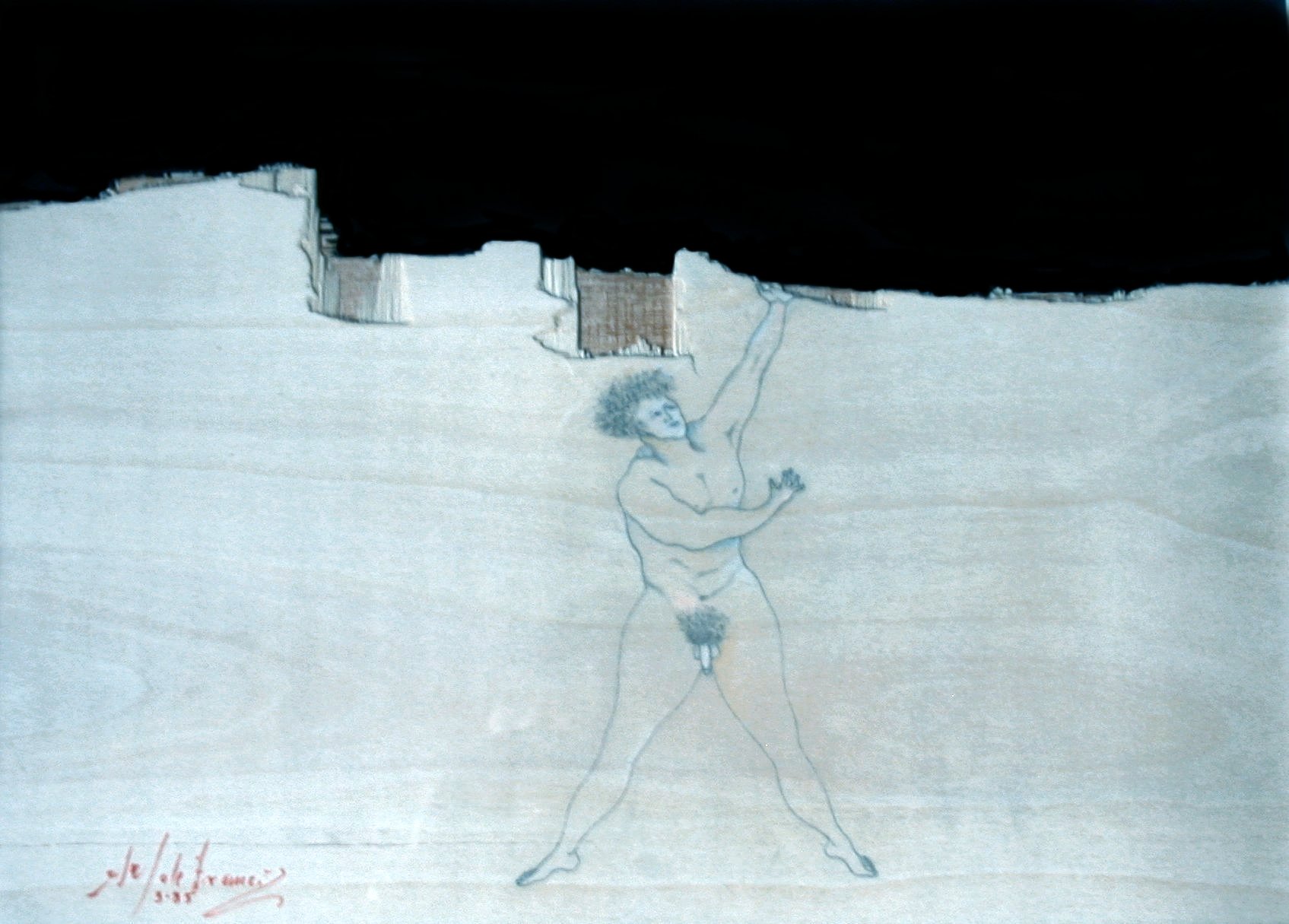 In seguito, e fino al 1990, de Francisco, quasi ricominciando da capo, esegue opere a matita e smalto su legno di compensato, ora spaccato in brandelli, ora assemblato con altri materiali (plastica in prevalenza). La tavola di compensato con le sue venature dai colori pastello era per Angelo un po’ l’elemento naturale da cui ripartire, per costruire qualcosa che avesse un valore, al di là di quella “rabbia” che aveva espresso fino ad allora. Aggiunge l’autore: