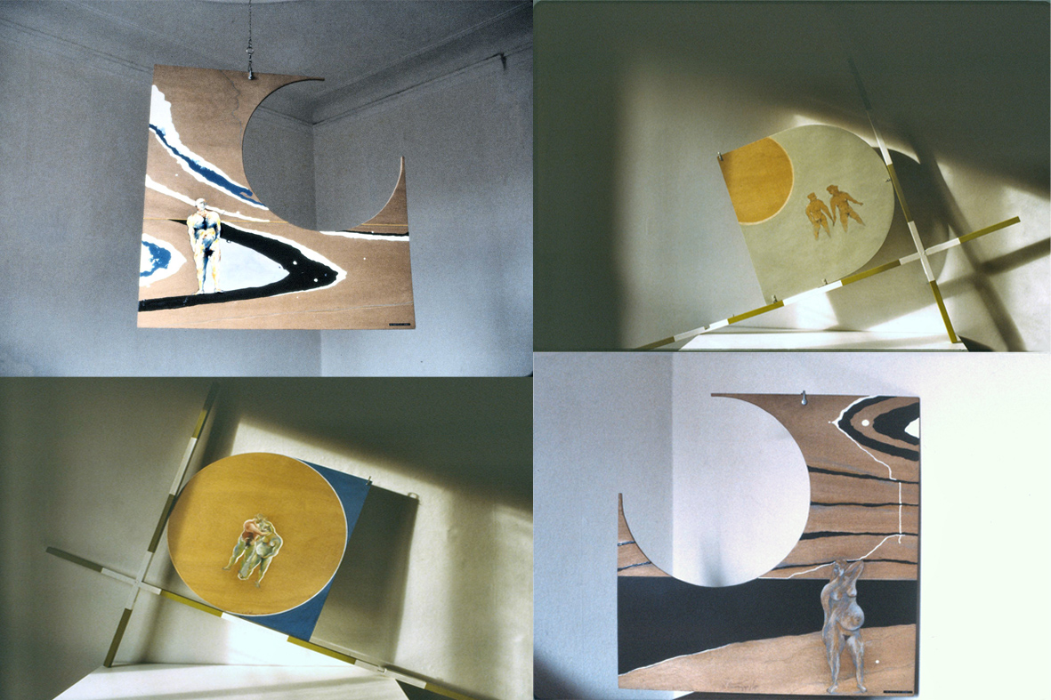 Dopo il 1979, invece, i miei lavori erano strutturati in modo da essere sospesi al centro dell’ambiente o di essere azionati dal fruitore, il quale, movendo funi o girandoci attorno, potesse seguire lo svolgimento di un’azione. Ciò che mi premeva esprimere, non era tanto il gioco formale di quelle strutture semovibili, quanto quello che ci andavo a raffigurare sopra. Da un lato c’ era l’inizio di un’ azione (un’ immagine colta in un certo atteggiamento) e sul retro o sul lato opposto, il punto di arrivo di quell’ azione; ma per arrivarci, era necessario “muoversi” da un punto fisso e girare intorno all’opera. Occorreva cioè compiere un’ azione per vedere il risultato finale. Lo stare a contemplare il quadro, in quel frangente, non aveva più senso. “L’ azione” è ciò che fa muovere il mondo, ciò che ci fa uscire da uno stato predeterminato per arrivare dove vogliamo. Si tratta di trovare ‘l’ azione” più giusta, più saggia, quella cioè che ci spinga verso una crescita piuttosto che quella che ci faccia retrocedere verso la catastrofe e la rovina. Questo era un po’ il concetto che cercavo di esprimere negli anni ’80-’83».