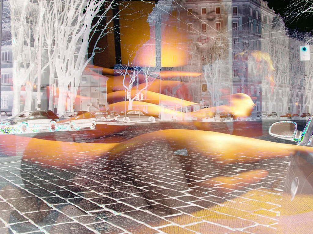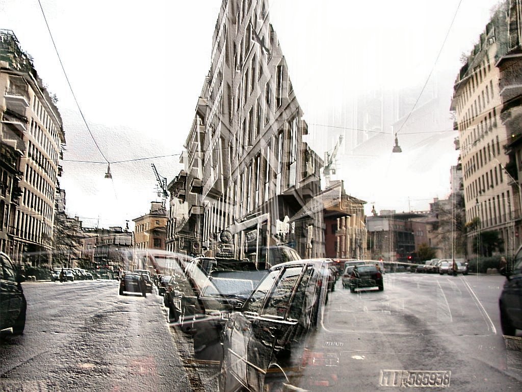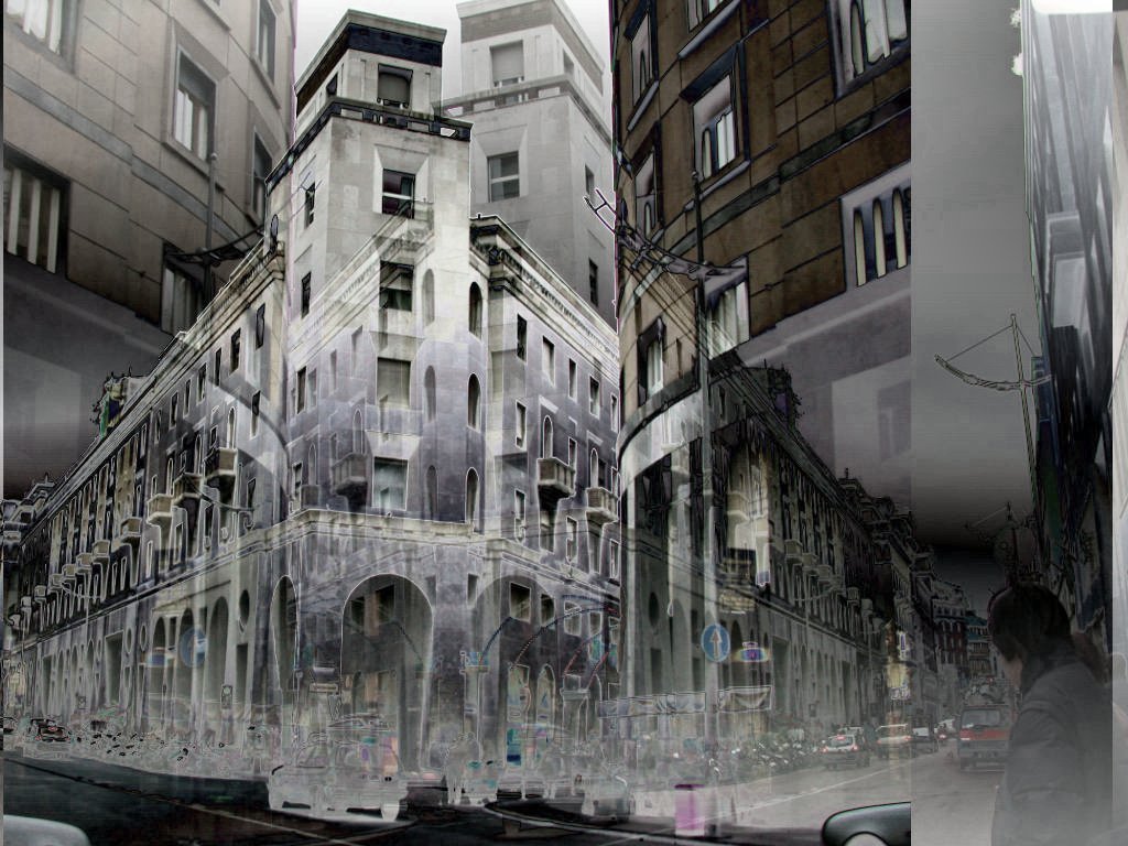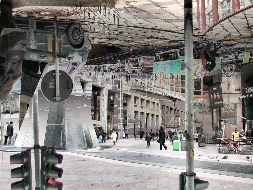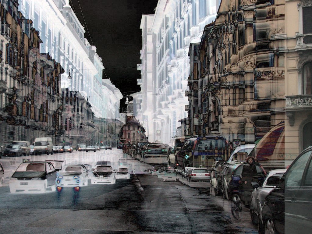 Oltre l’Immagine che appare grigia e di cemento accozzato di lamiere d’auto anonime, tentativo di vedere una città-comunità più umana, più a portata del nostro bisogno di amore, del nostro bisogno di stare con gli altri. Di una città insomma che vada oltre la burocrazia del funzionale e del “tutto al suo posto”, e si apra all’essenza dell’uomo che poi, in fondo, è l’unico che la abita e la vive giorno dopo giorno. Questa città oltre la città!” (2004)