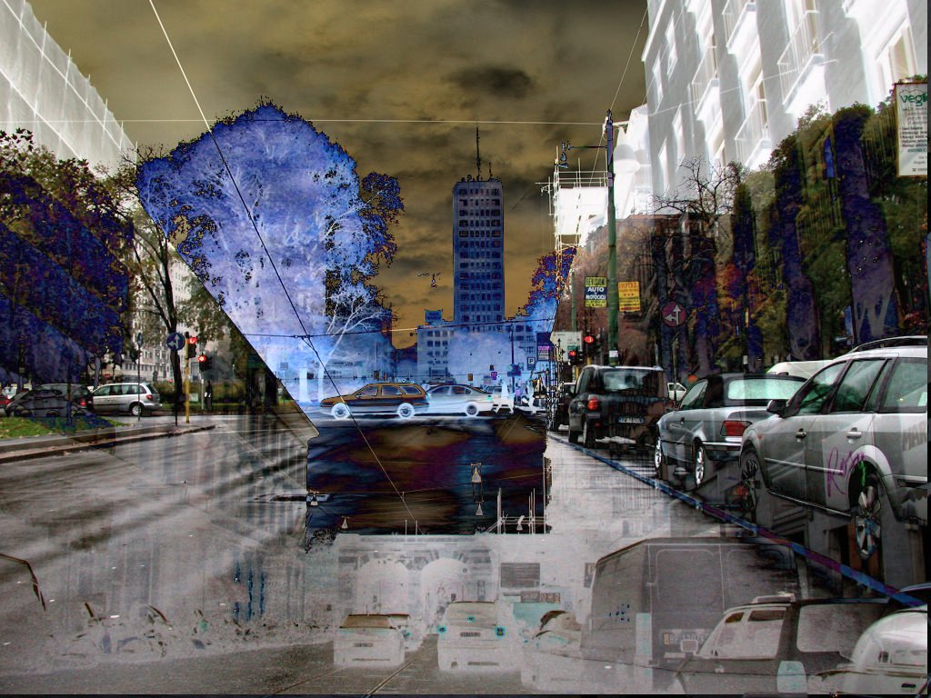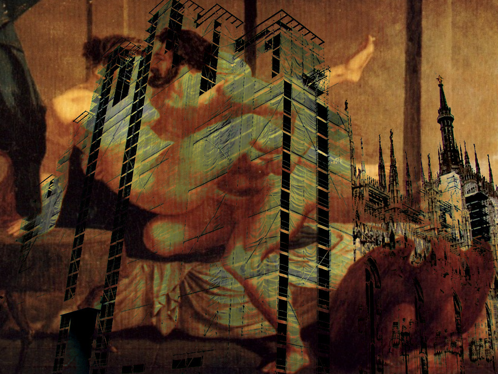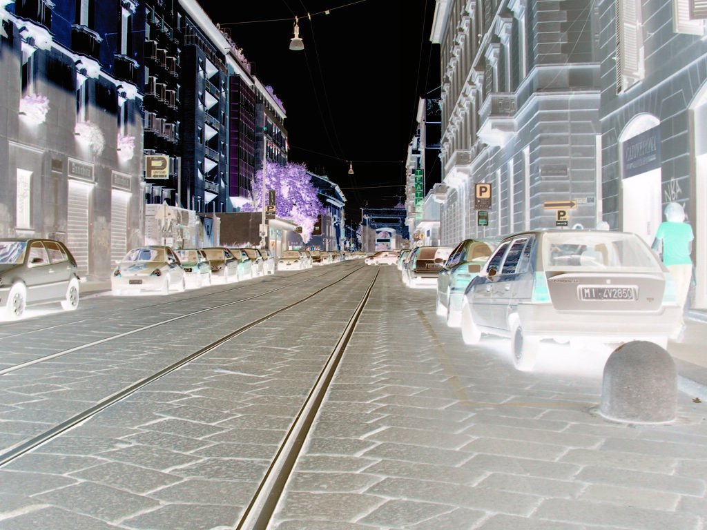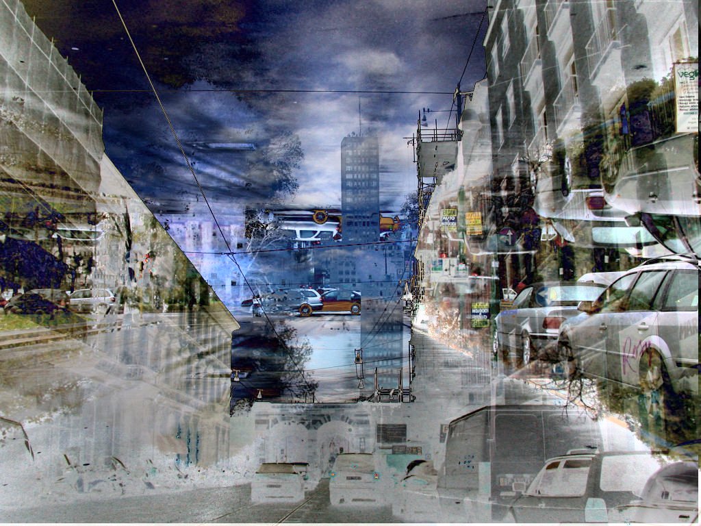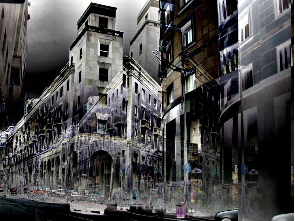 Oltre l’Immagine che appare grigia e di cemento accozzato di lamiere d’auto anonime, tentativo di vedere una città-comunità più umana, più a portata del nostro bisogno di amore, del nostro bisogno di stare con gli altri. Di una città insomma che vada oltre la burocrazia del funzionale e del “tutto al suo posto”, e si apra all’essenza dell’uomo che poi, in fondo, è l’unico che la abita e la vive giorno dopo giorno. Questa città oltre la città!” (2004)
