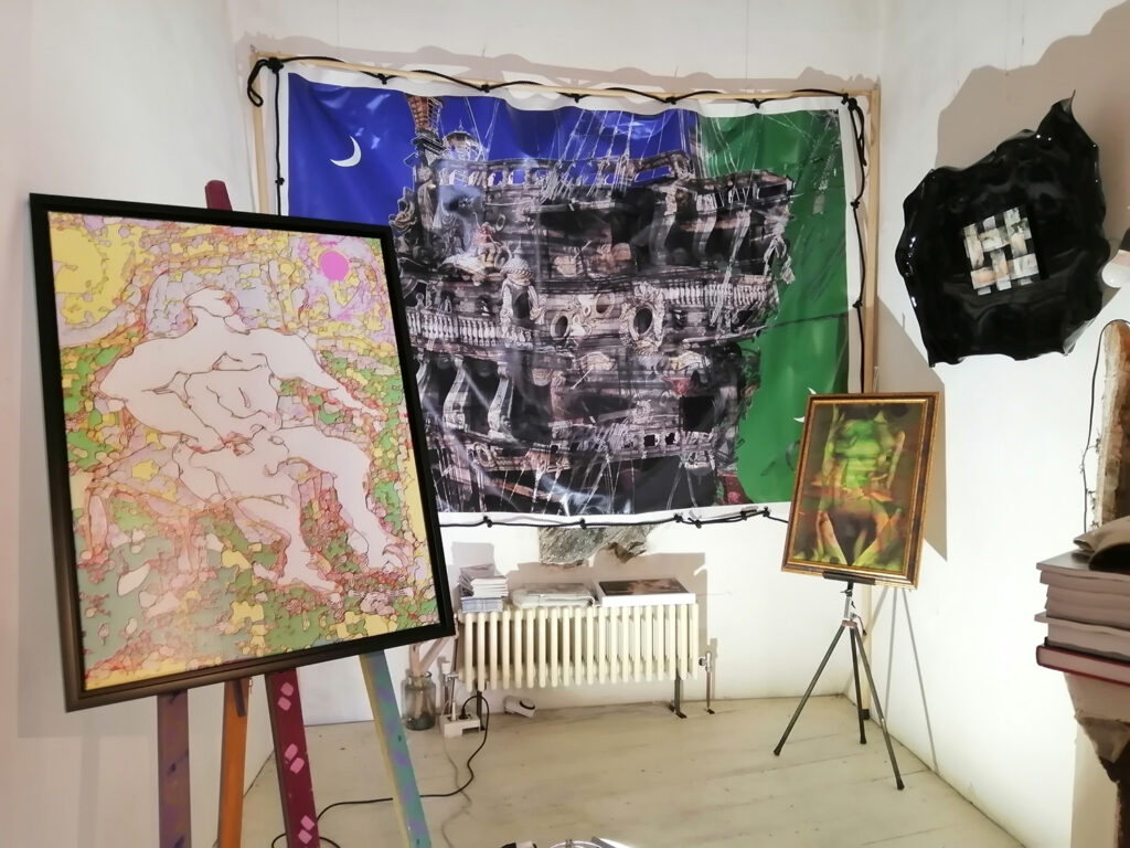 L’opera si configura come un’ esplorazione ardita e complessa della contemporaneità, realizzata attraverso un linguaggio visivo che sfida e stimola l’ osservatore. L’ artista, con l’ uso sapiente della tecnologia e dei materiali moderni, crea un’ opera che oscilla tra l’ astratto e il figurativo, tra il caos e l’ ordine, riflettendo le contraddizioni e le ambiguità del nostro tempo. La composizione è un caleidoscopio di colori vivaci e linee dinamiche, che si intrecciano e si sovrappongono in un groviglio di forme fluide e cangianti.