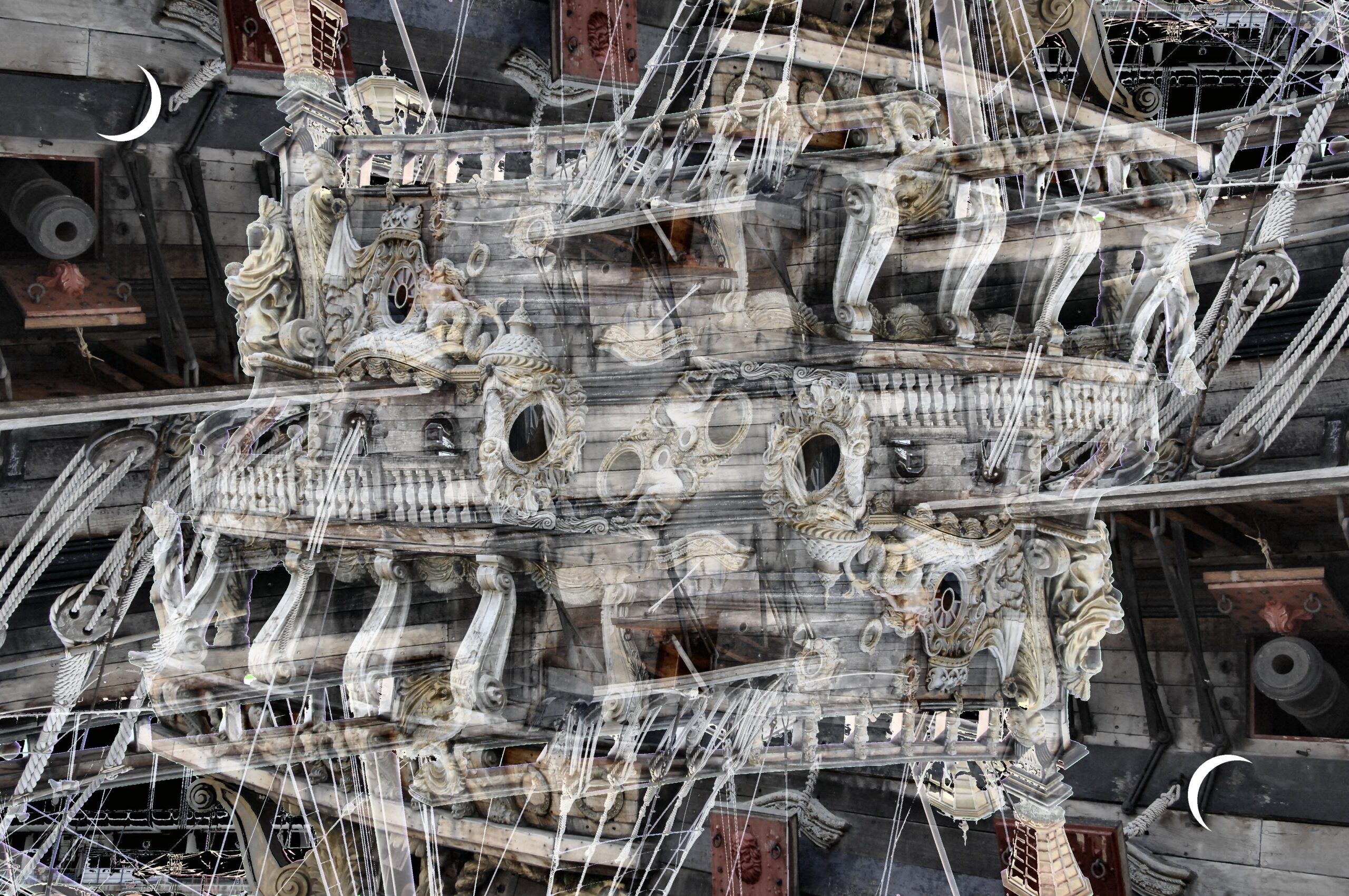 Al centro, una figura umana emerge con forza, quasi come un’ ombra luminosa, delineata da contorni sottili e da una miriade di dettagli intricati. Questa figura, in bilico tra la materialità e l’evanescenza, sembra rappresentare l’ essenza stessa dell’umanità, eternamente sospesa tra il tangibile e l’ intangibile.