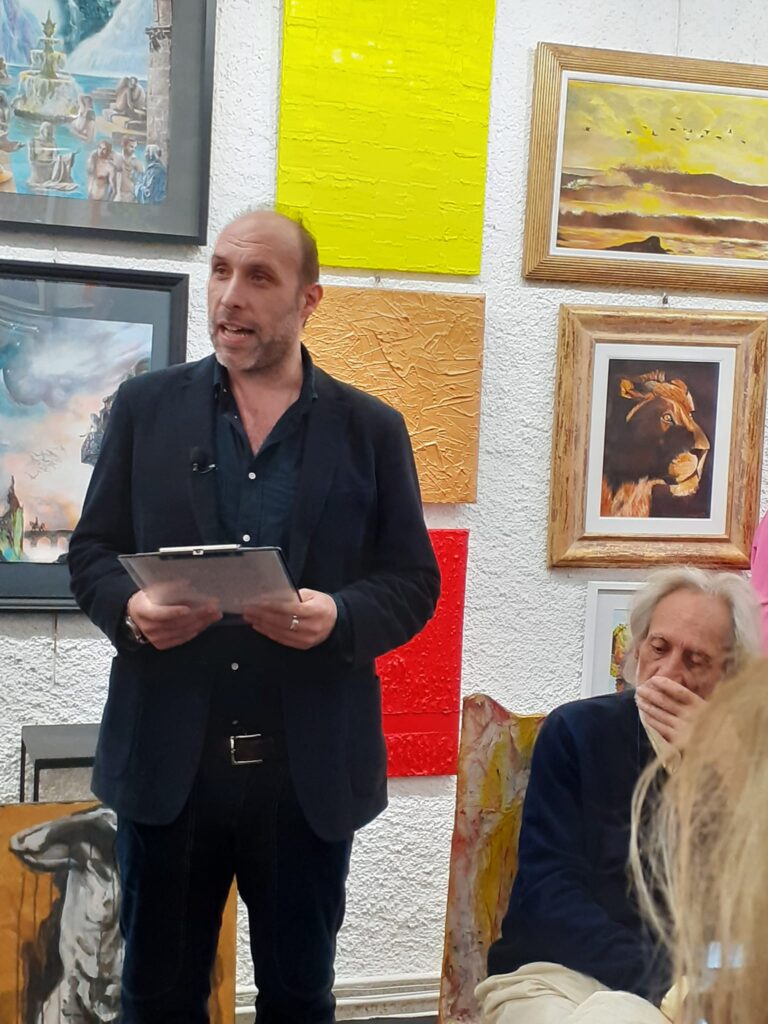 ….”Tra gli artisti presenti in mostra abbiamo l’opera di Angelo de Francisco da titolo “Verso”. Un’opera realizzata con la tecnica mista e la stampa digitale, quindi un’opera contemporanea che usa anche i mezzi della contemporaneità.