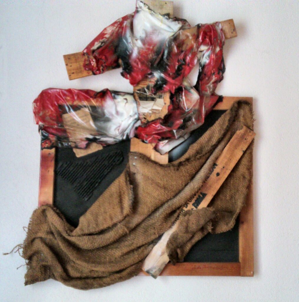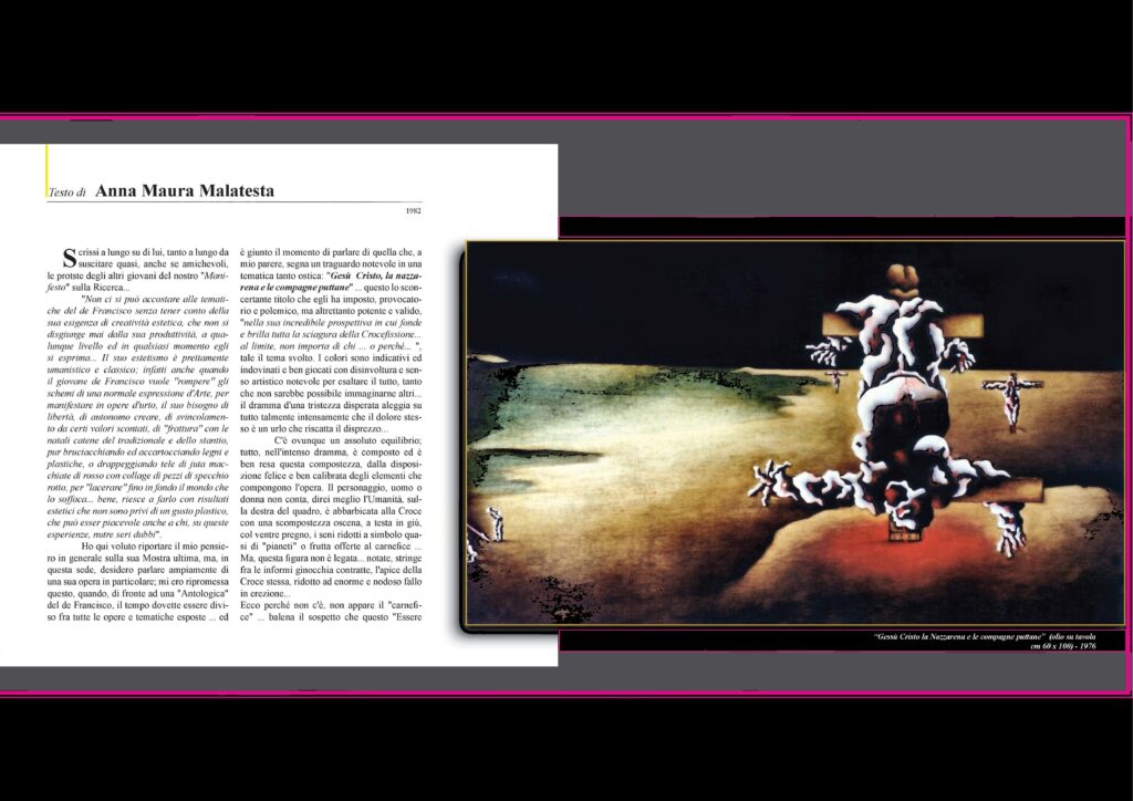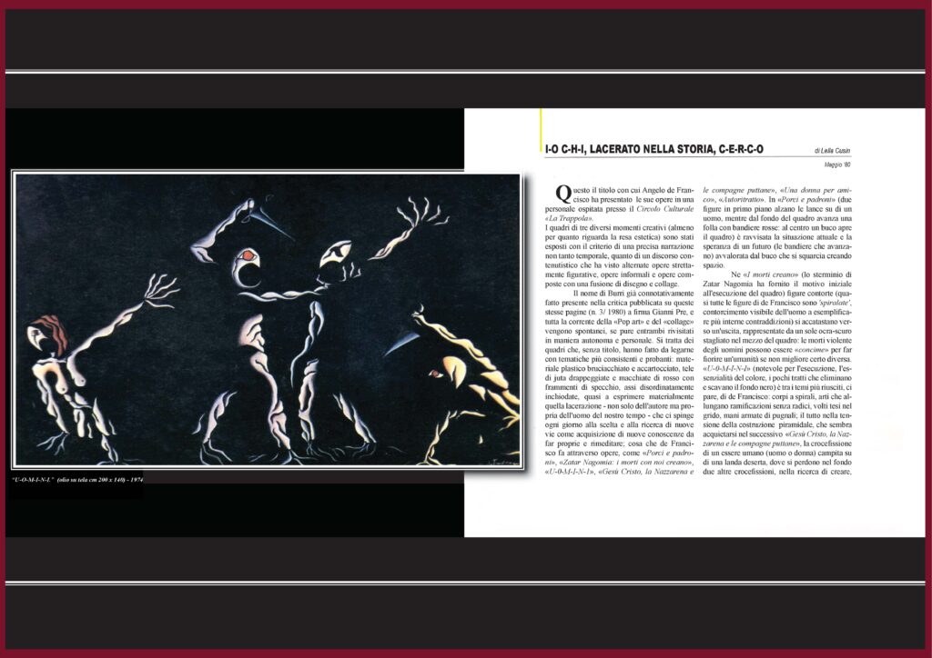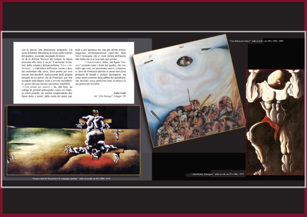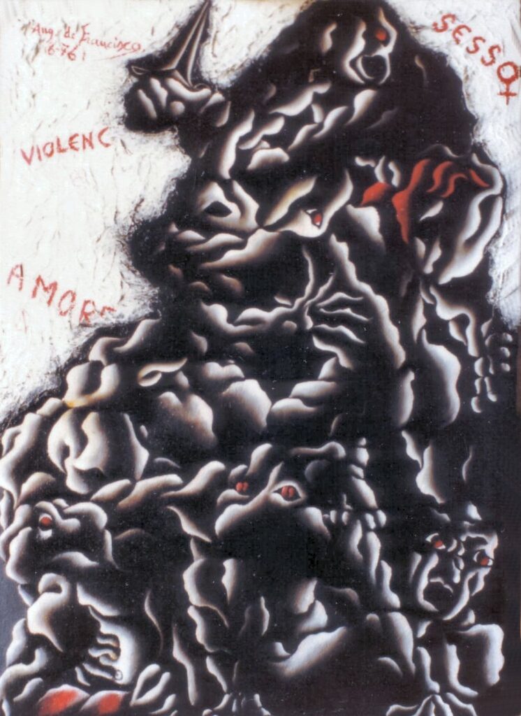 Il frastagliato percorso artistico di Angelo de Francisco, che si è articolato e sviluppato in almeno quattro fasi, trae le proprie origini da e in tale alveolo di alienata fissità esistenziale; da questo universo congelato in fittizie presenze, da queste temperie di idee coagulate in una combustione centripeta. Eppure, questa adesione alla problematica di Burri, non è il fulcro della sua tematica — le << combustioni >> del nostro fanno parte di una stagione creativa da tempo superata —; ma era importante risalire al punto germinativo, poiché nei successivi stadi, l’artista ha operato uno scavo, in un certo senso un’analisi che motivasse, sviscerandone l’essenza, quella scelta, accettata in modo troppo assiomatico, che lo aveva predisposto a calarsi in quell’arido retroterra culturale.