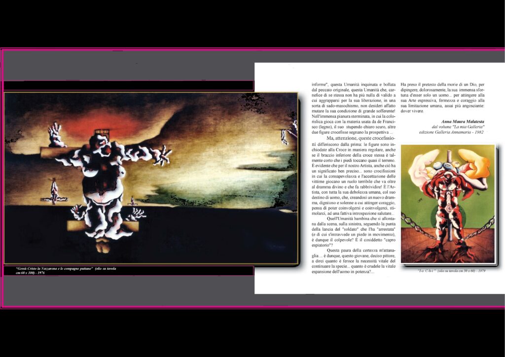 I personaggi di questi vacillanti quanto opprimenti scenari sono degli esseri belluini, che fuoriescono da grotte-prigioni, o partoriscono mostruose creature, oppure si dilaniano al cospetto di enormi idoli: simboli tangibili della forma calamitante e repressiva del potere. Di un ordine costituito che funge da regista-attore-spettatore nel muovere i fili di una rappresentazione di larve umane — del loro dentro e fuori — sempre sottomesse alla sua minacciante autorità. (Da “Alla Bottega” novembre/dicembre 1987 di Gianni Pre )