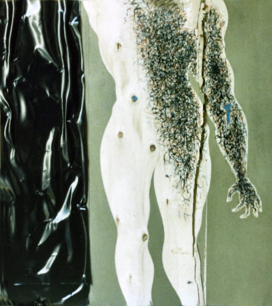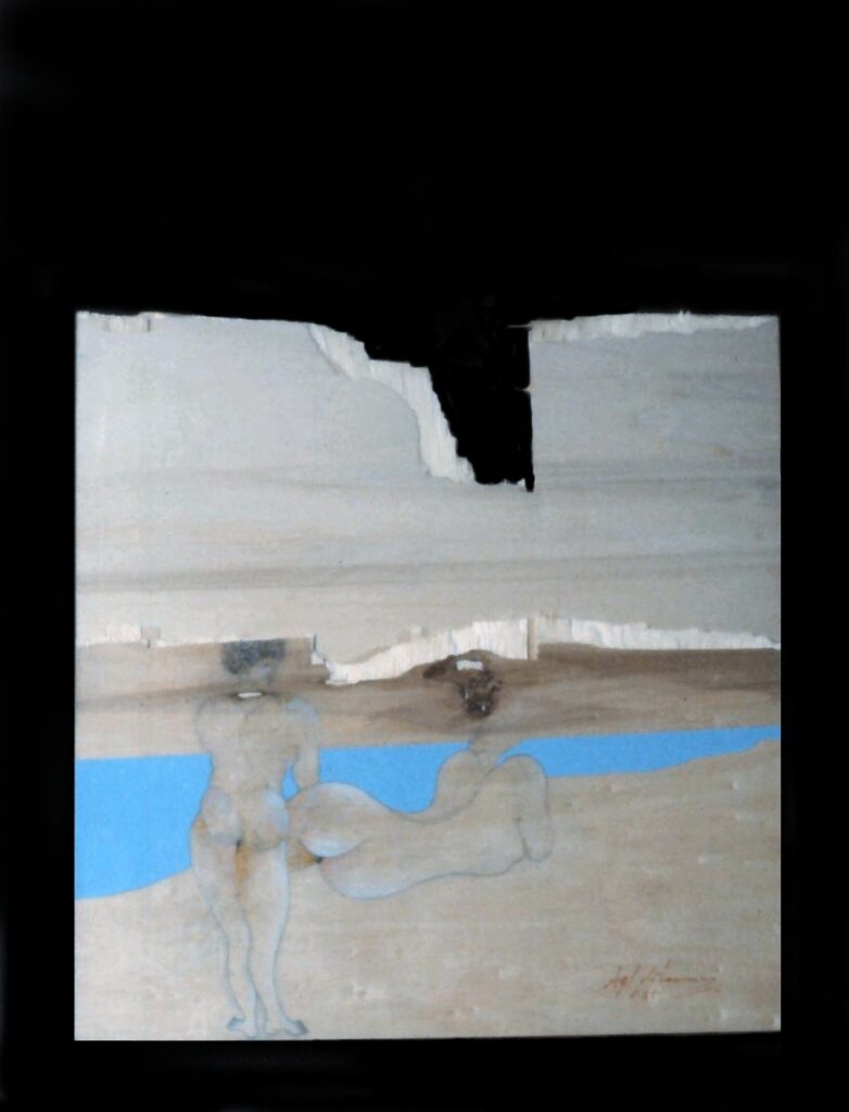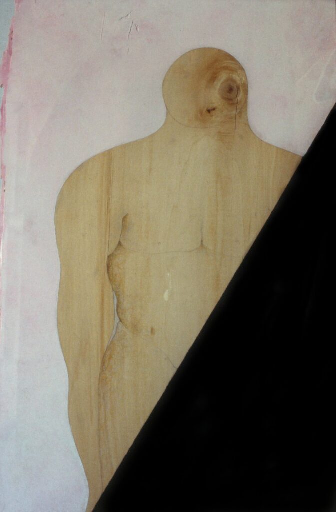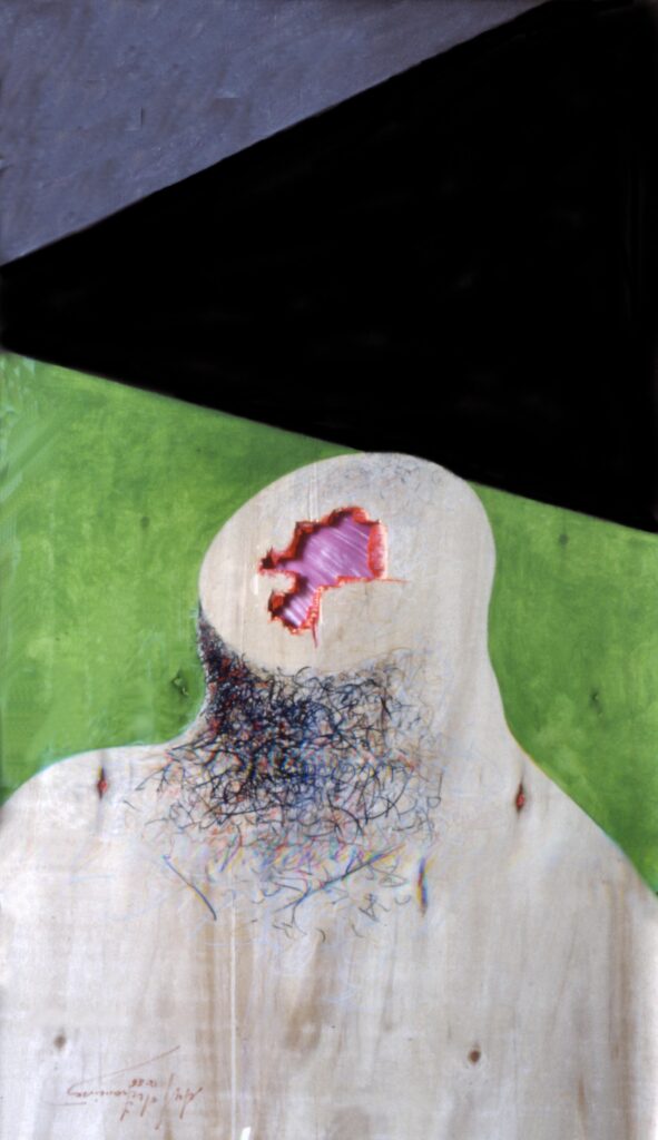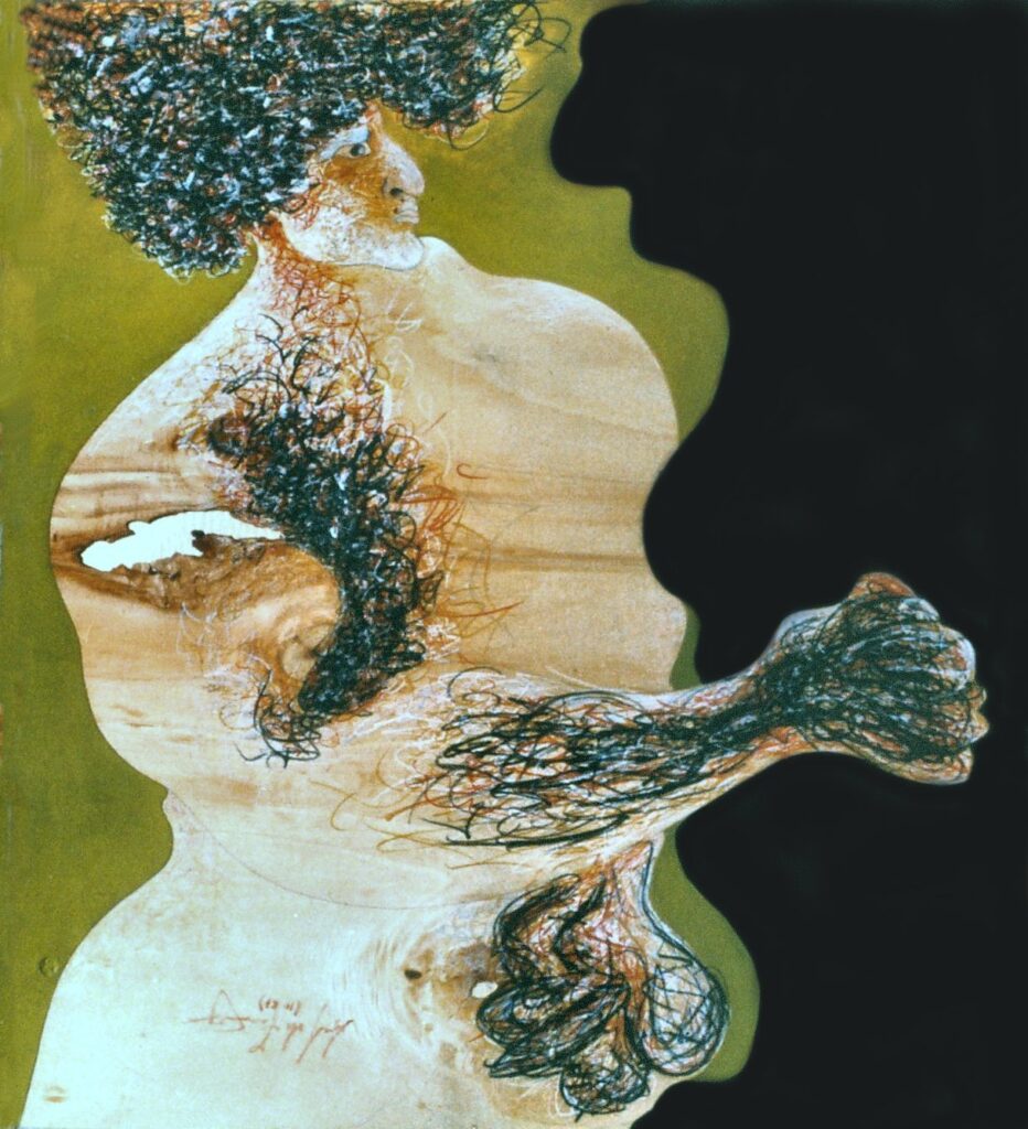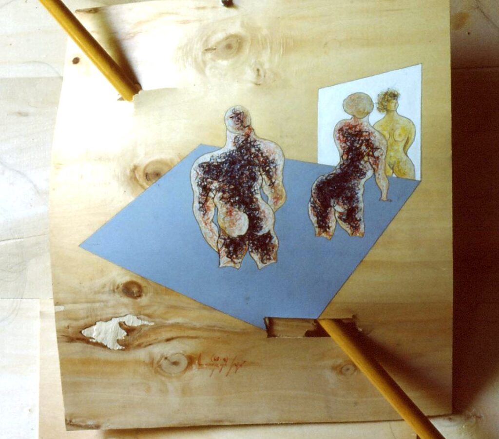 “….Il << legno >>, essenziale supporto in anni di ricerche, qui viene utilizzato in senso aspramente metaforico. Non solo la superficie dei quadri, colorata con tonalità tenui, ai limiti della trasparenza, è di compensato, ma pure le figure, intagliate in listelli di legno. Quale contrasto tra il calore che emana questa materia — persino il suo odore sa darci delle sensazioni di dolcezza e di pacata serenità — e ciò che raffigura! Presenze gonfie, ipertrofiche sebbene reali, di una selva umana senza palpiti: disarmonizzata. Automi. Che scorrono su nastri obbligati in una specie di epica della robotizzazione: affamati di codici e di numeri; e se talvolta si ribellano vanno a sbattere contro compatte muraglie color lavagna — la sequela di una cancrena di anni << senza moto né spinta >>? —, rimanendo imprigionati, paralizzati in uno spasimo che li sfonda, o li taglia in due tronconi in un’istantanea di vitalità assiderata.