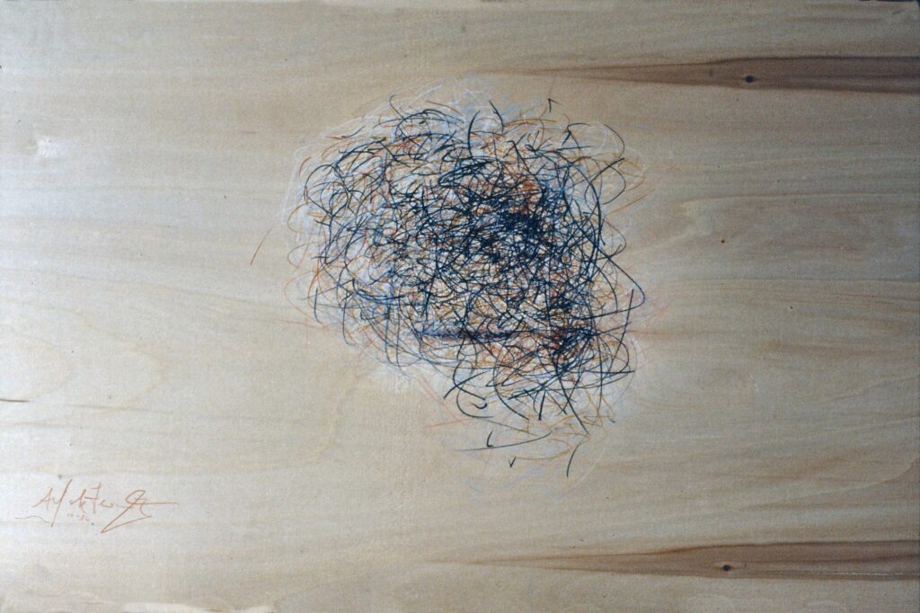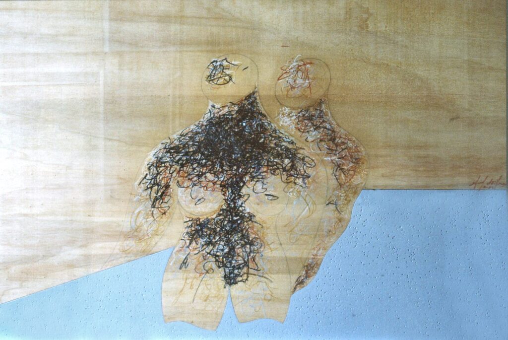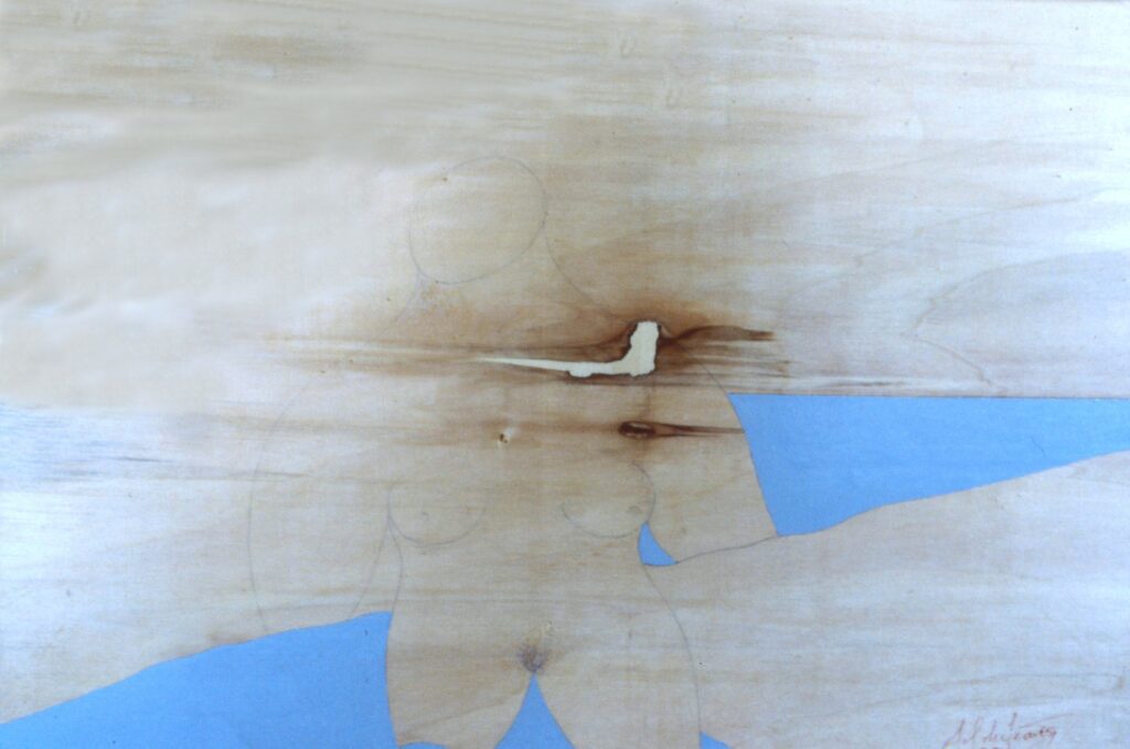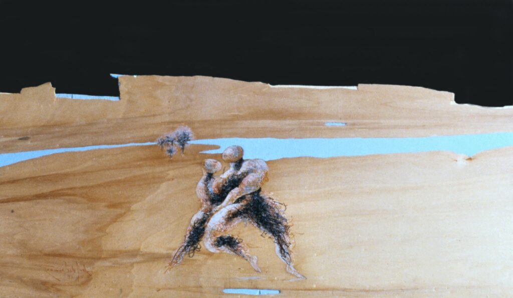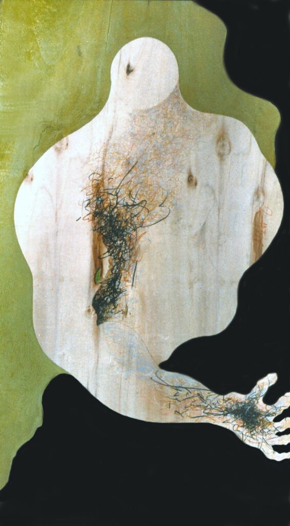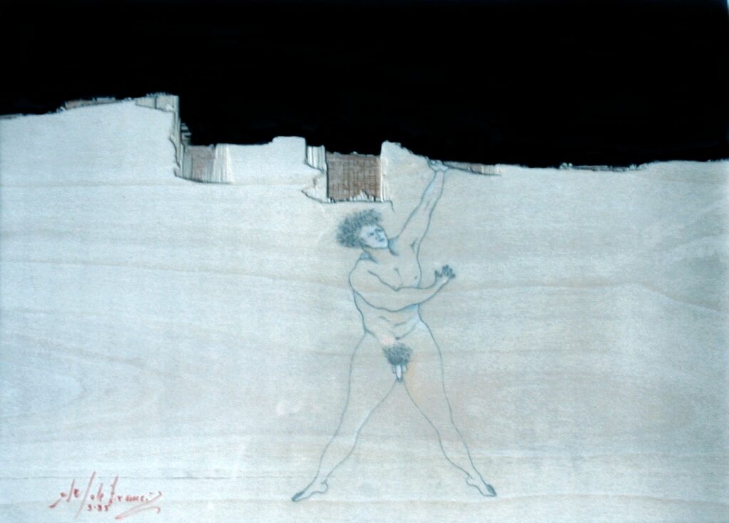 “….Il << legno >>, essenziale supporto in anni di ricerche, qui viene utilizzato in senso aspramente metaforico. Non solo la superficie dei quadri, colorata con tonalità tenui, ai limiti della trasparenza, è di compensato, ma pure le figure, intagliate in listelli di legno. Quale contrasto tra il calore che emana questa materia — persino il suo odore sa darci delle sensazioni di dolcezza e di pacata serenità — e ciò che raffigura! Presenze gonfie, ipertrofiche sebbene reali, di una selva umana senza palpiti: disarmonizzata. Automi. Che scorrono su nastri obbligati in una specie di epica della robotizzazione: affamati di codici e di numeri; e se talvolta si ribellano vanno a sbattere contro compatte muraglie color lavagna — la sequela di una cancrena di anni << senza moto né spinta >>? —, rimanendo imprigionati, paralizzati in uno spasimo che li sfonda, o li taglia in due tronconi in un’istantanea di vitalità assiderata.