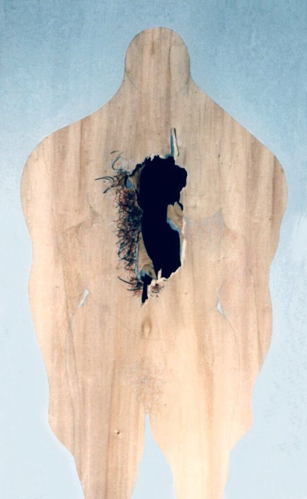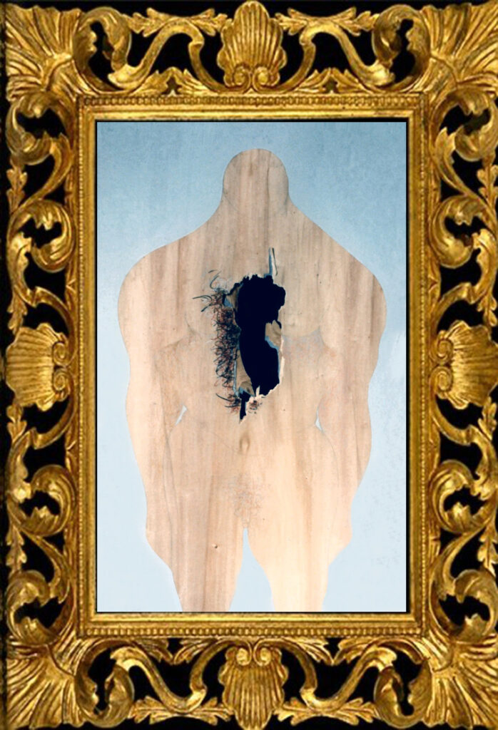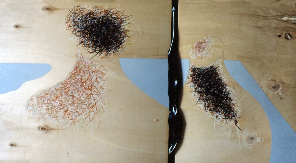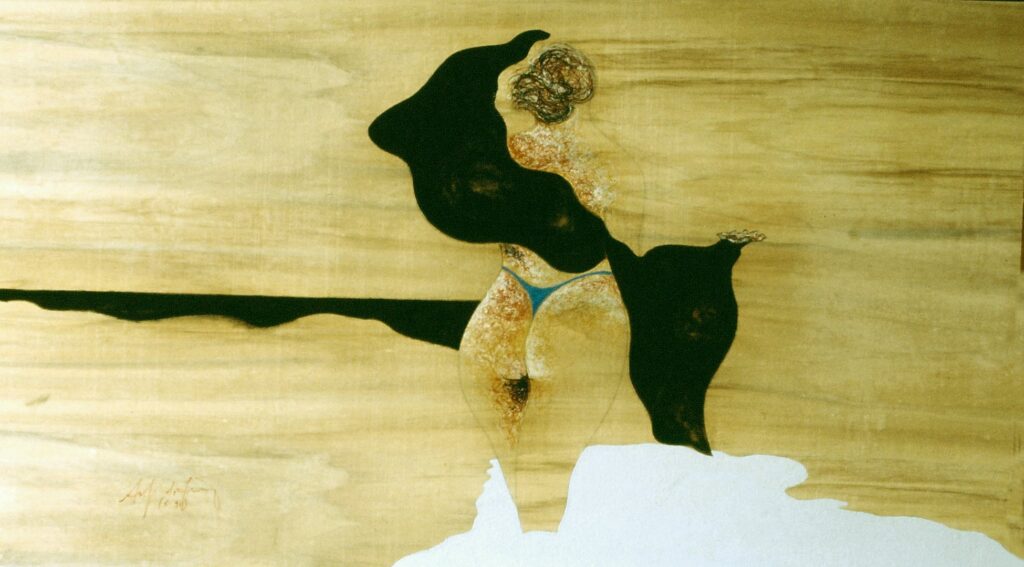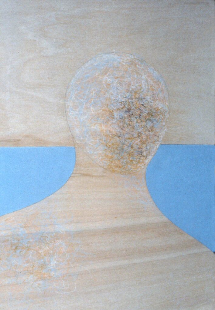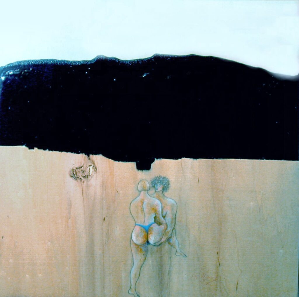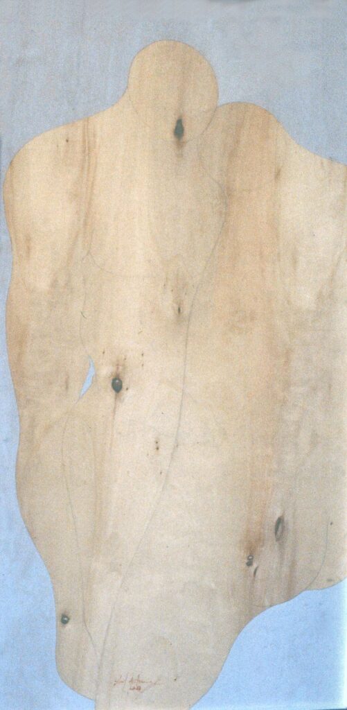 “….Il << legno >>, essenziale supporto in anni di ricerche, qui viene utilizzato in senso aspramente metaforico. Non solo la superficie dei quadri, colorata con tonalità tenui, ai limiti della trasparenza, è di compensato, ma pure le figure, intagliate in listelli di legno. Quale contrasto tra il calore che emana questa materia — persino il suo odore sa darci delle sensazioni di dolcezza e di pacata serenità — e ciò che raffigura! Presenze gonfie, ipertrofiche sebbene reali, di una selva umana senza palpiti: disarmonizzata. Automi. Che scorrono su nastri obbligati in una specie di epica della robotizzazione: affamati di codici e di numeri; e se talvolta si ribellano vanno a sbattere contro compatte muraglie color lavagna — la sequela di una cancrena di anni << senza moto né spinta >>? —, rimanendo imprigionati, paralizzati in uno spasimo che li sfonda, o li taglia in due tronconi in un’istantanea di vitalità assiderata.